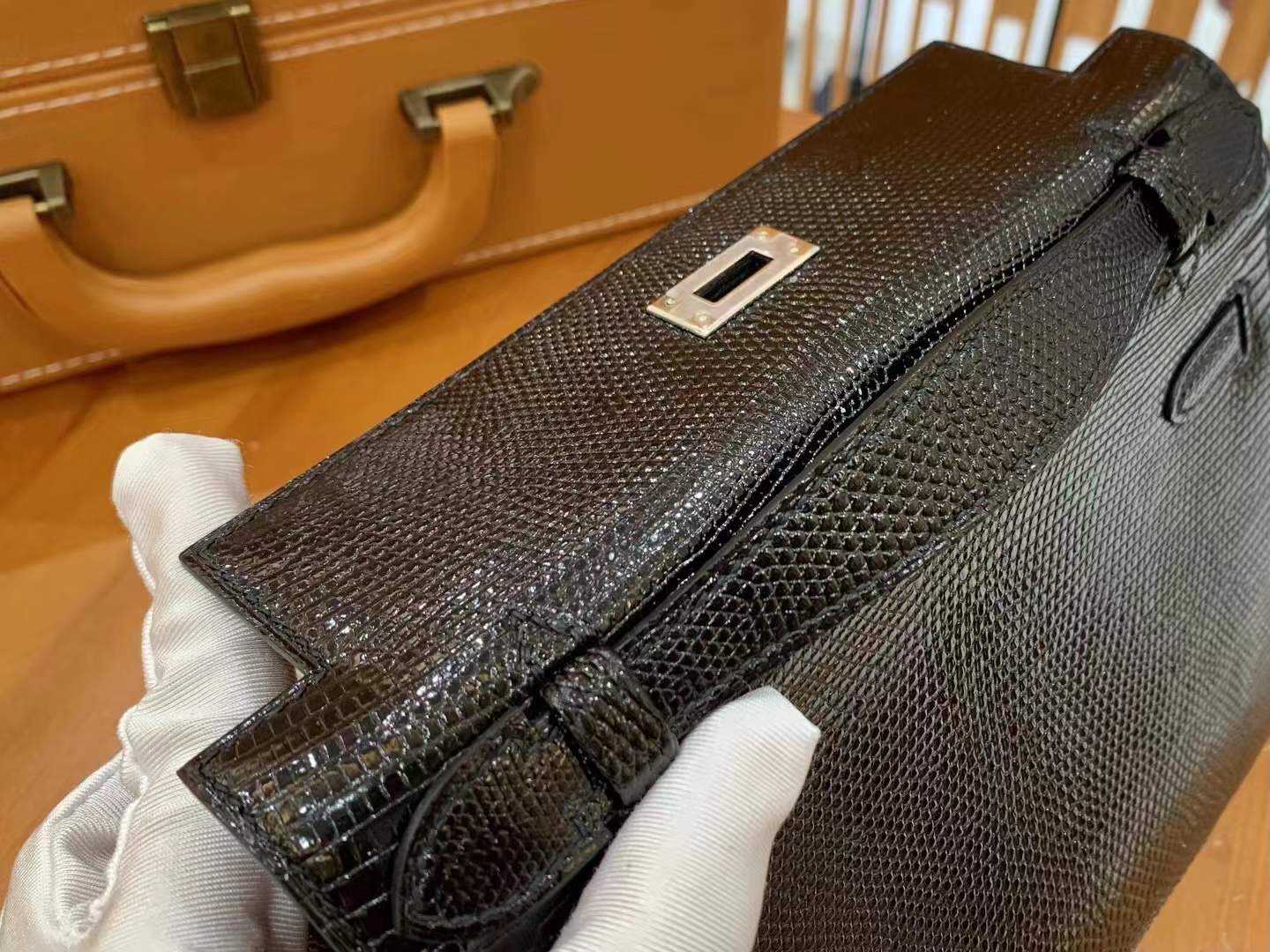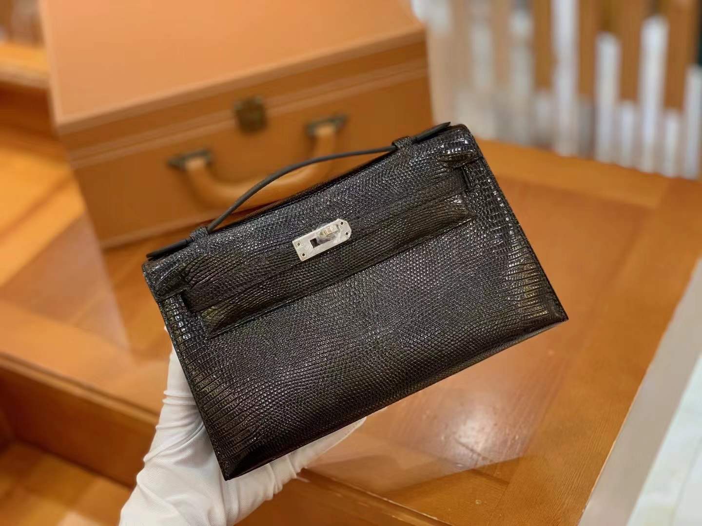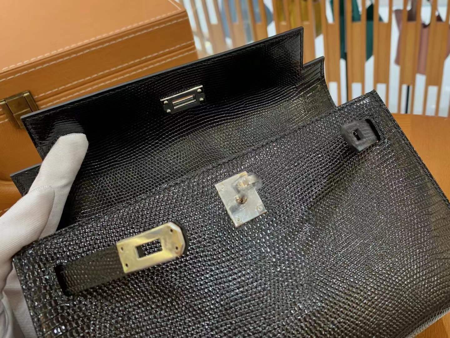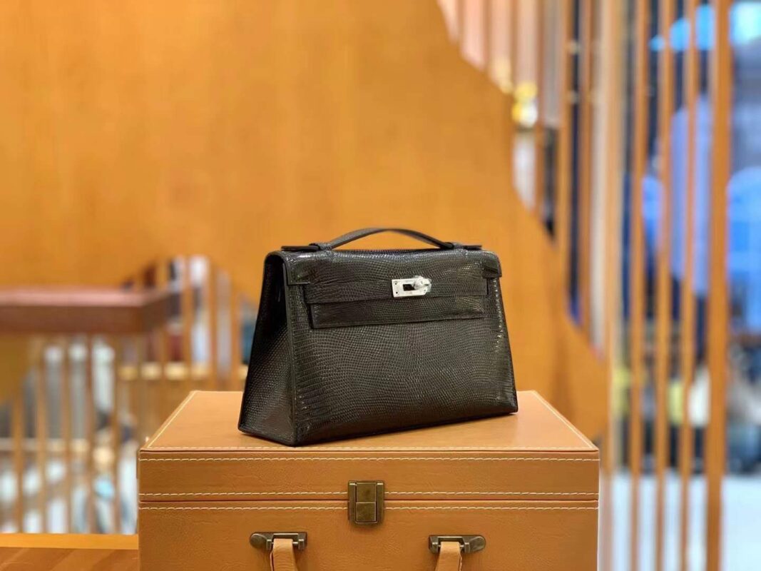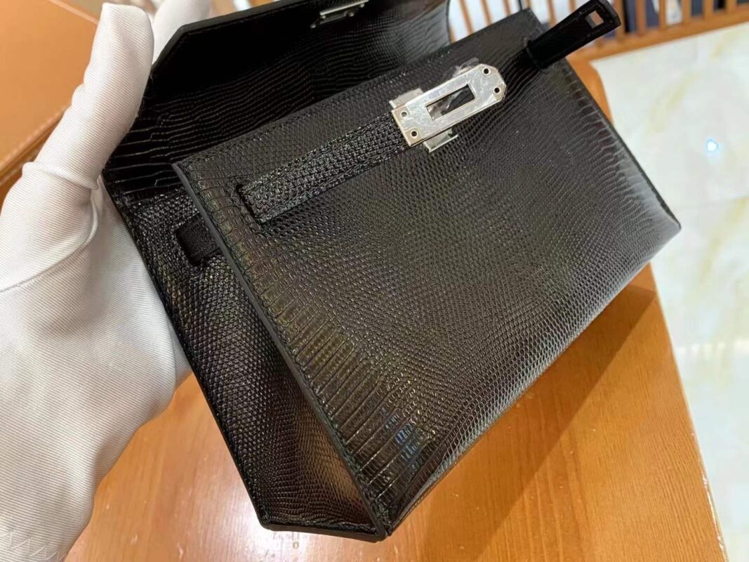 Mini Kelly Generation 22cm Black Silver Imported wild lizard skin. Hand-sewn