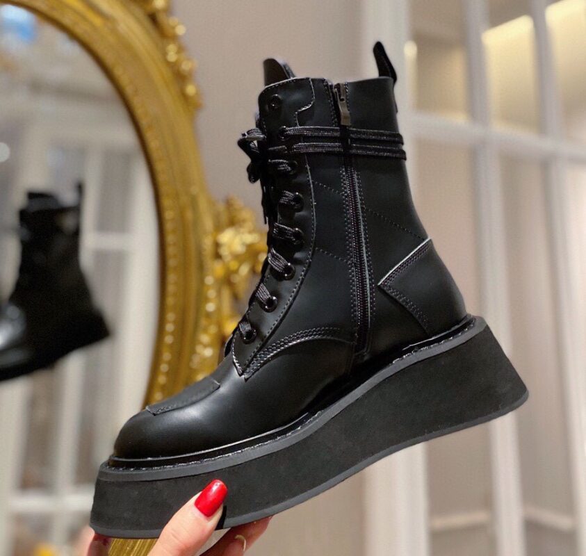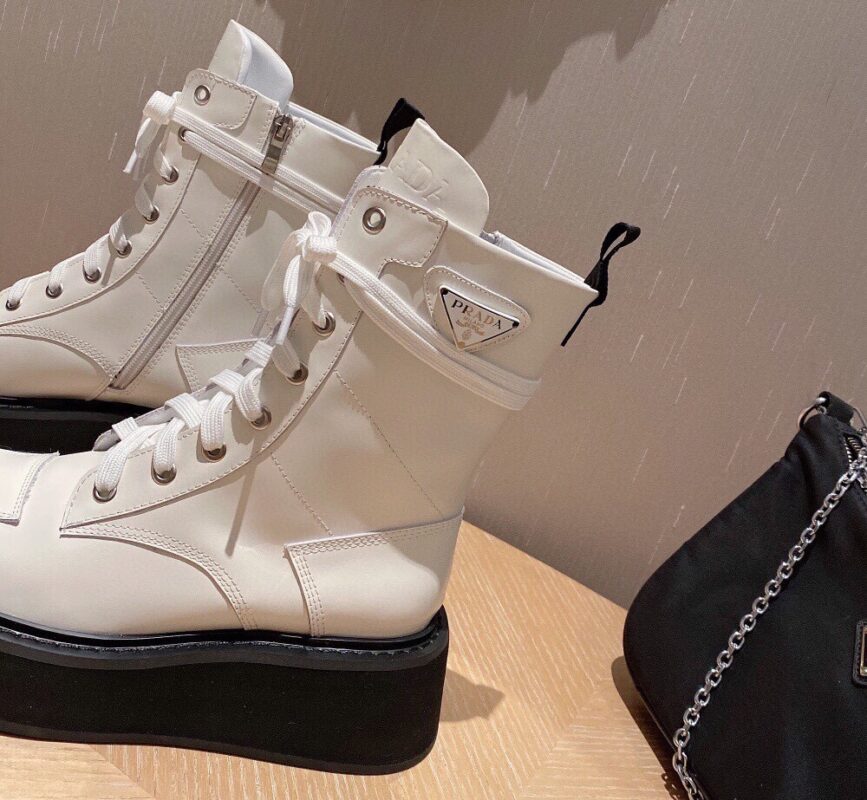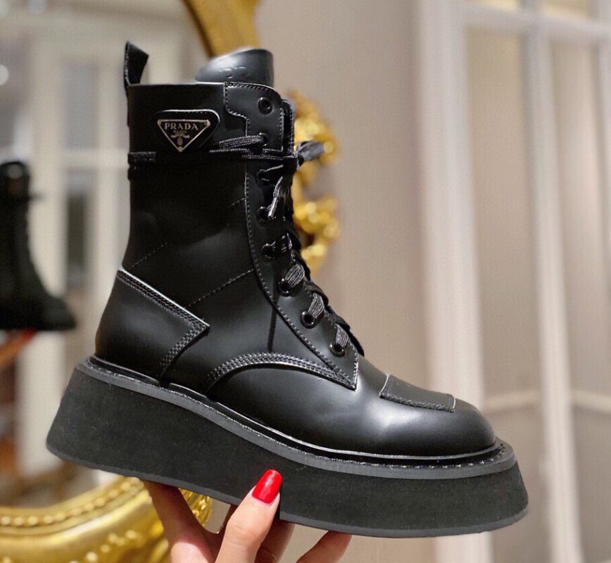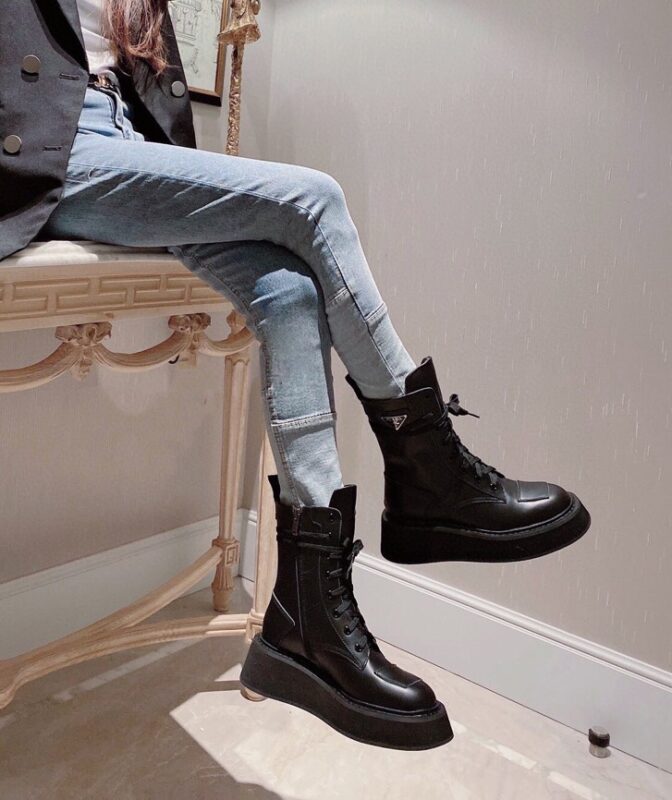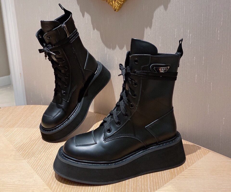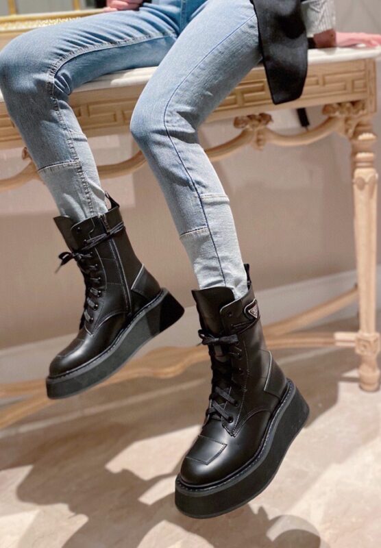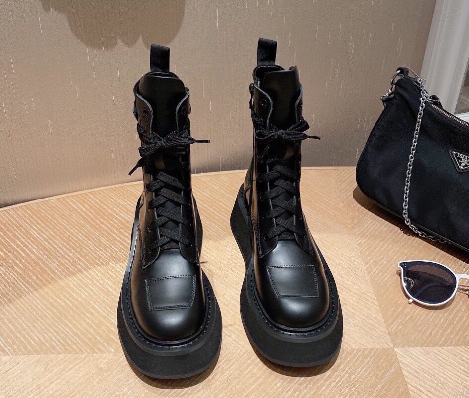 【Prada】• Paris show style star boots Handsome Martin Series ☑️ Open edge bead cowhide surface, inner leather lining sheepskin Outsole non-slip wear-resistant new thick sole Bottom thickness and height: 4.5~5cm Side triangle logo dotted with “logo” Standard code: 35-40 (40 customized non-refundable)