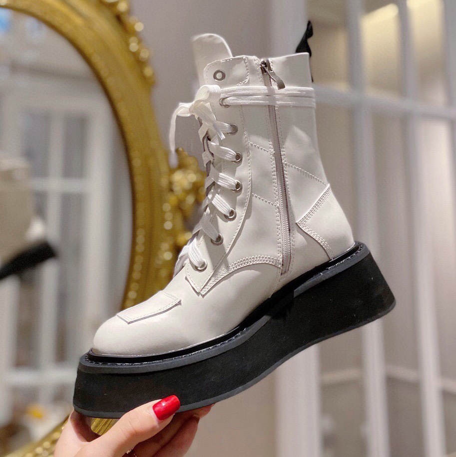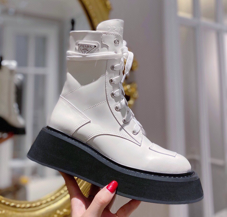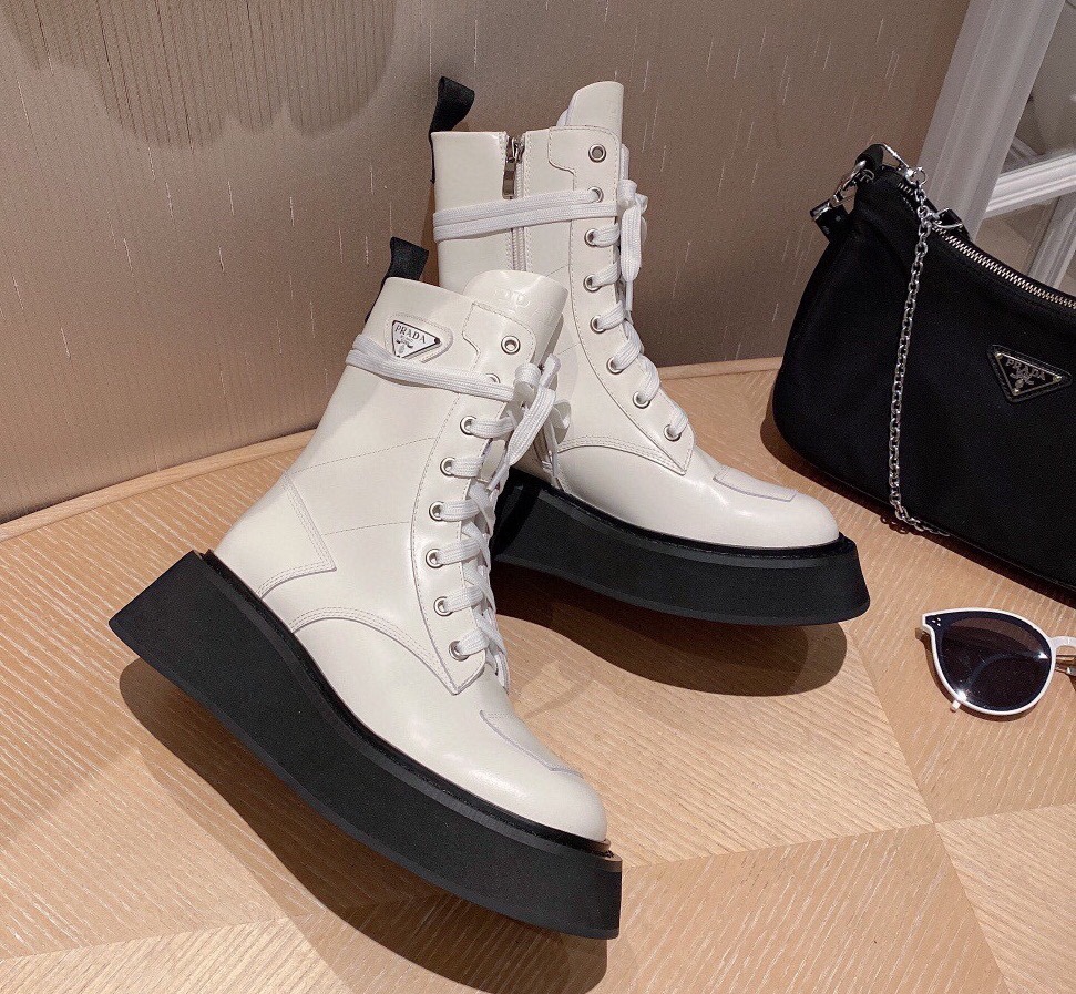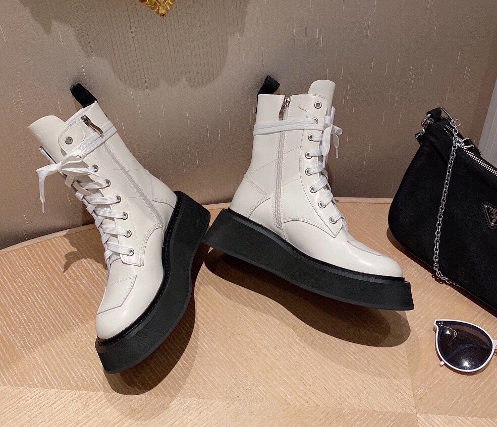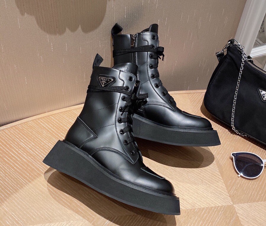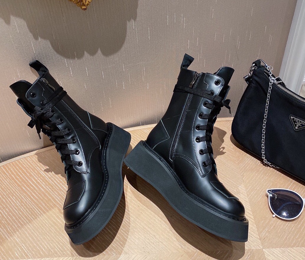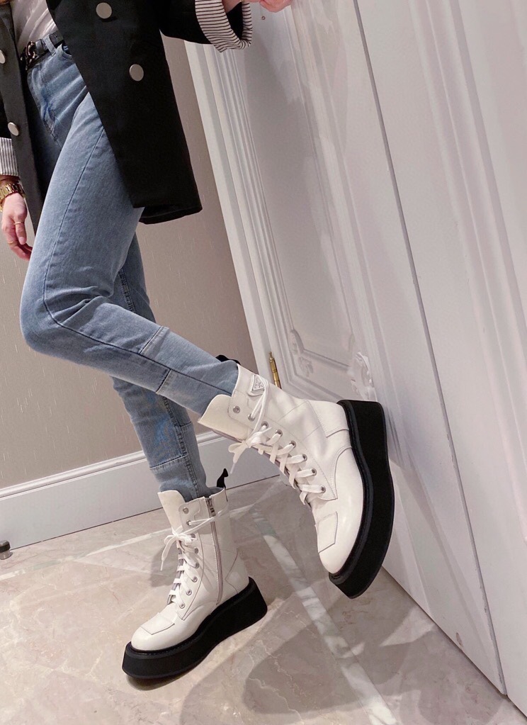 【Prada】• Paris show style star boots Handsome Martin Series ☑️ Open edge bead cowhide surface, inner leather lining sheepskin Outsole non-slip wear-resistant new thick sole Bottom thickness and height: 4.5~5cm Side triangle logo dotted with “logo” Standard code: 35-40 (40 customized non-refundable)