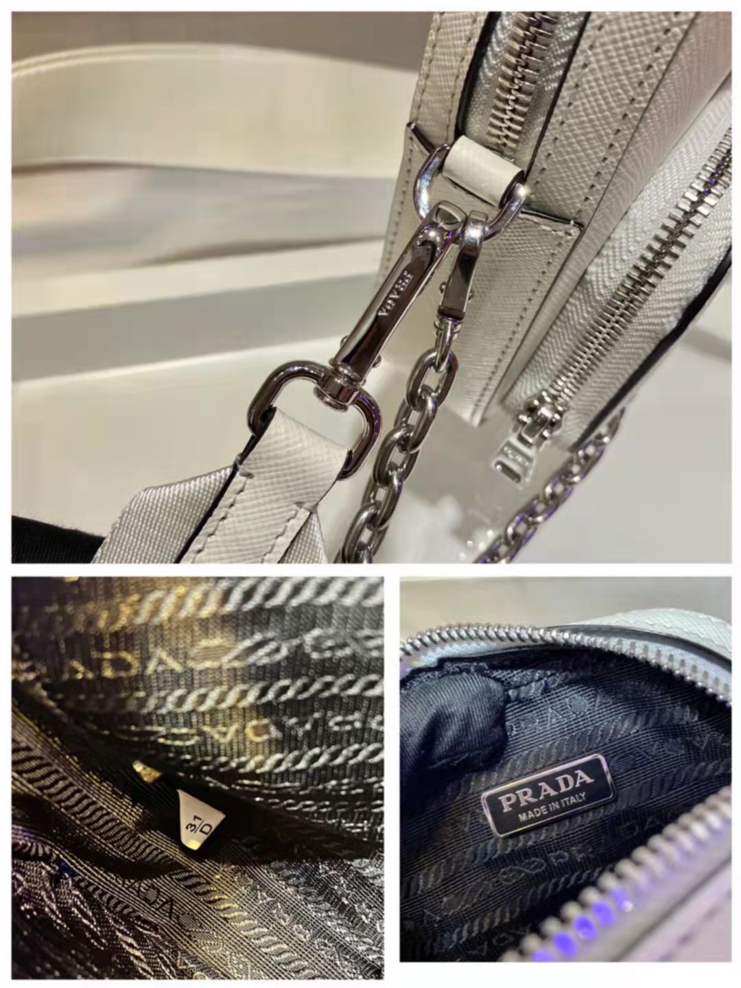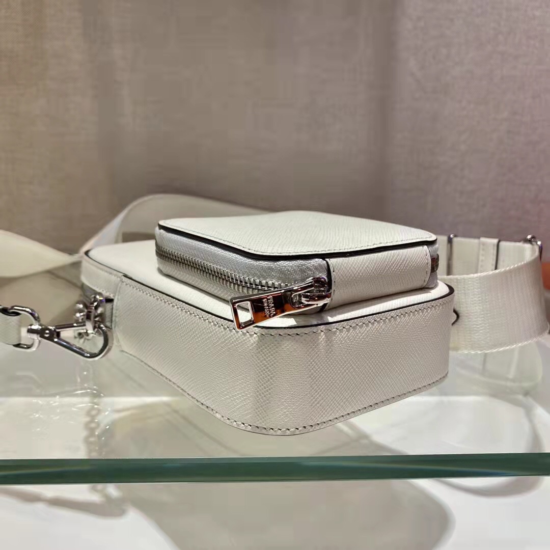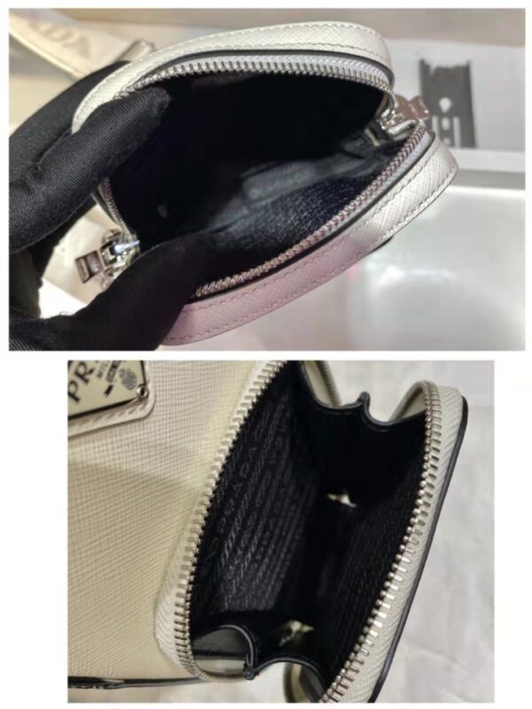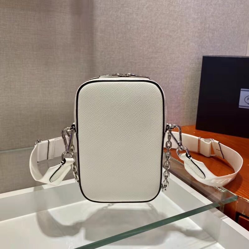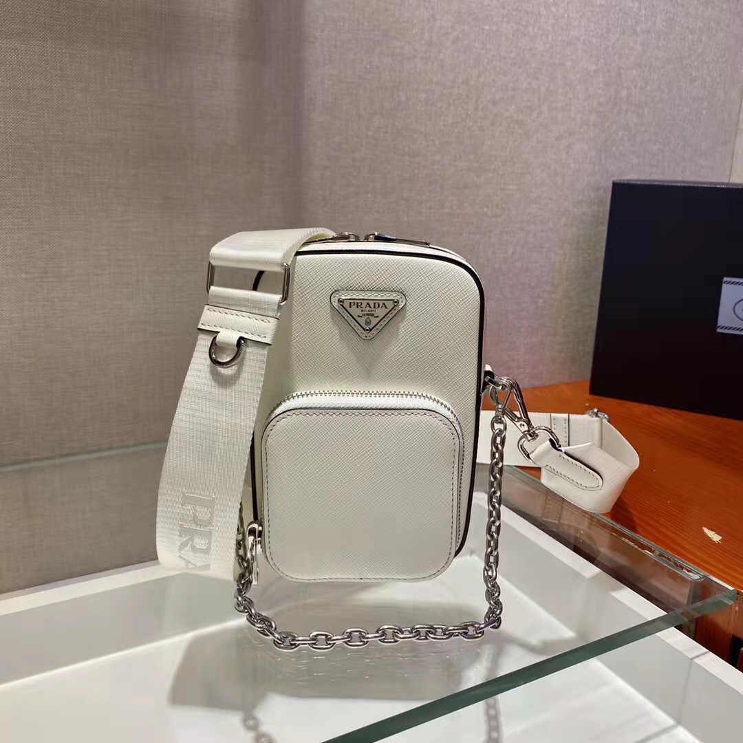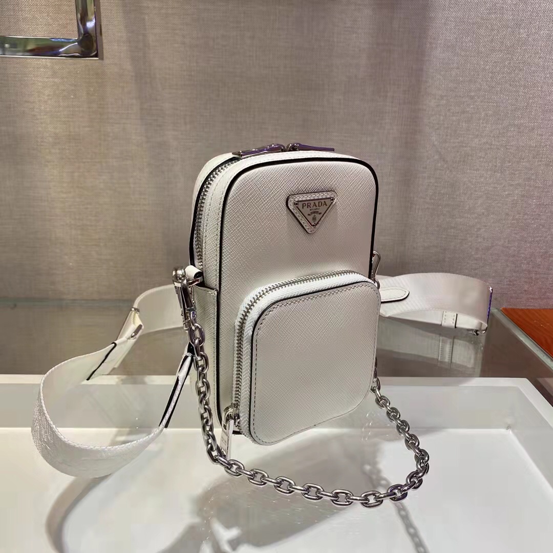 Mini handbags 🎊 Functional and modern, this mini bag is crafted in saffiano leather. Presents a cross-hatched texture and a waxed finish. The enamelled triangular metal logo is ingeniously decorated, and it is equipped with a detachable iron chain and a long nylon shoulder strap. This exquisite and compact design has a very cool upper body effect. ha][hey ha] Length 11x height 17.5x bottom 3.5cm