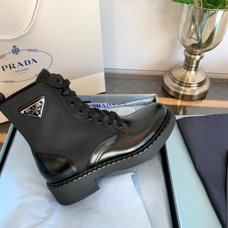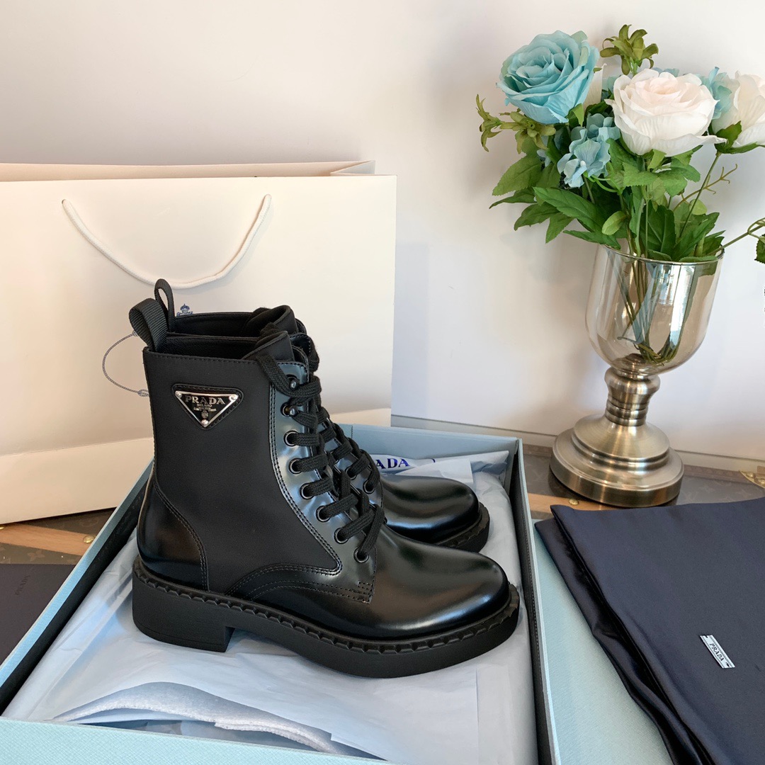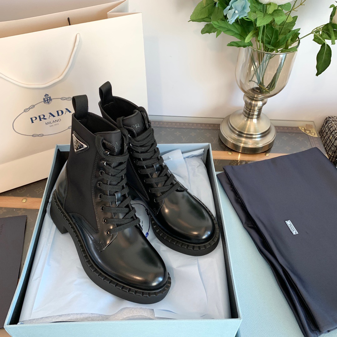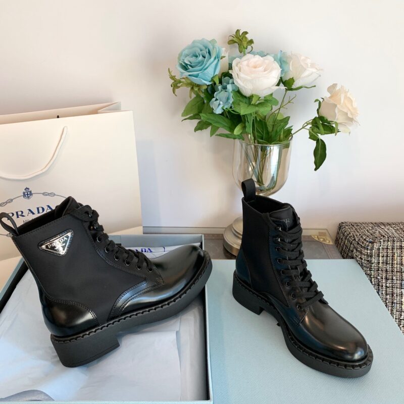 Prada nylon stitching lace-up motorcycle boots️ Simple and elegant. Nylon surface is comfortable and breathable, durable and timeless. Super handsome and versatile, 3.5 cm thick bottom. Upper feet feel light. Taller and thinner. Upper: Beads, Polyester Cotton Inner: Mixed-breed sheep Foot: Silk Calfskin Outsole: TPU rubber foam outsole. Non-slip and wear-resistant. [Heel height: 3.5CM] 𝐒𝐈𝐙𝐄: 35, 36, 37, 38, 39,