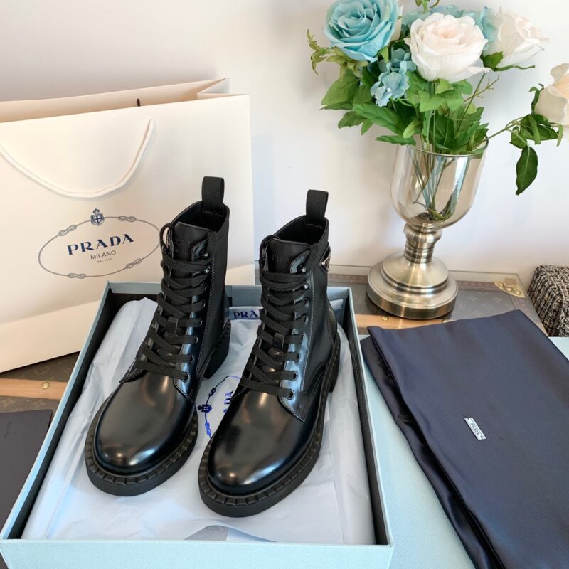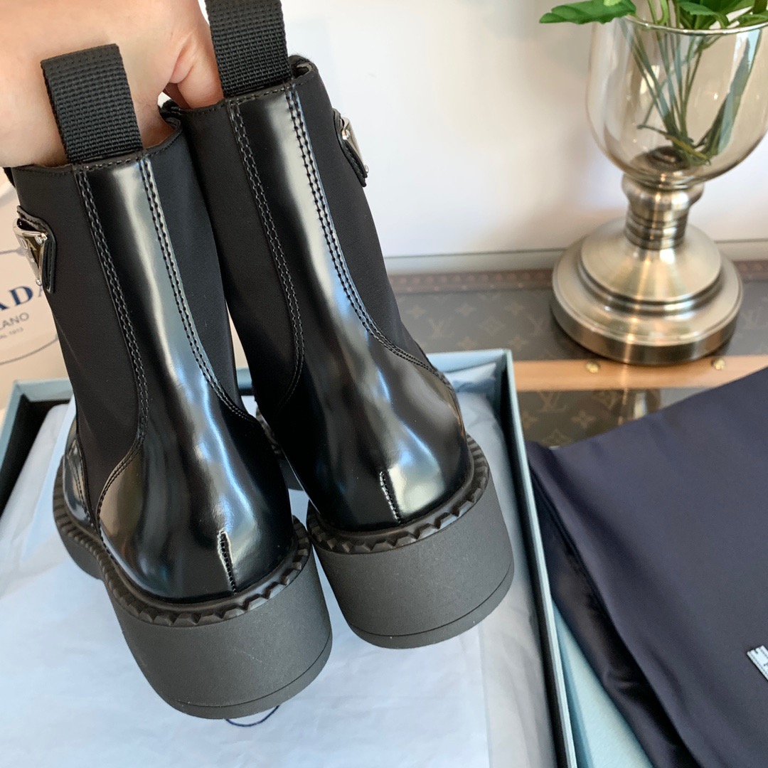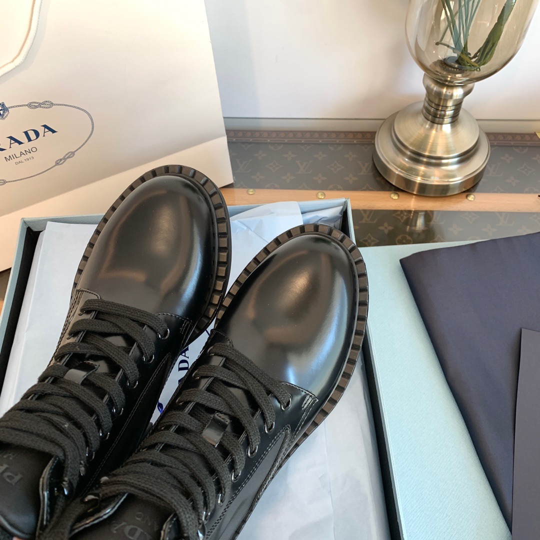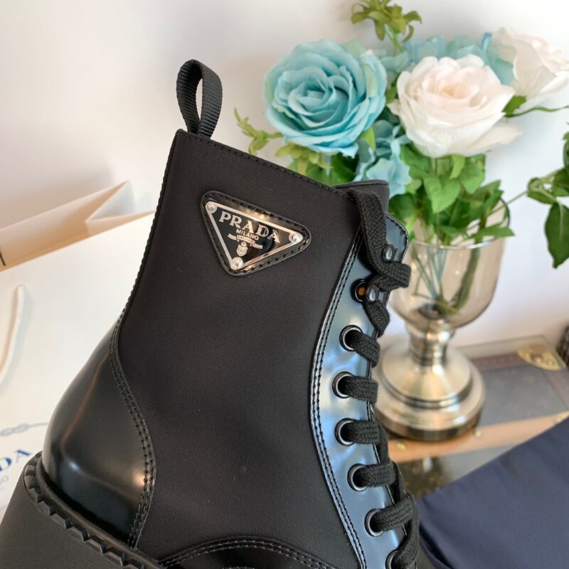 Prada nylon stitching lace-up motorcycle boots️ Simple and elegant. Nylon surface is comfortable and breathable, durable and timeless. Super handsome and versatile, 3.5 cm thick bottom. Upper feet feel light. Taller and thinner. Upper: Beads, Polyester Cotton Inner: Mixed-breed sheep Foot: Silk Calfskin Outsole: TPU rubber foam outsole. Non-slip and wear-resistant. [Heel height: 3.5CM] 𝐒𝐈𝐙𝐄: 35, 36, 37, 38, 39,