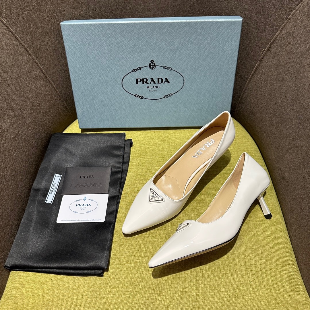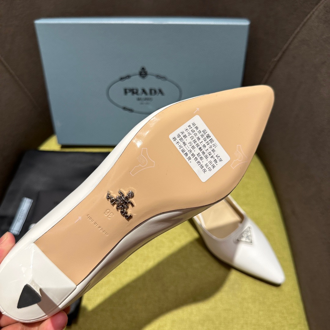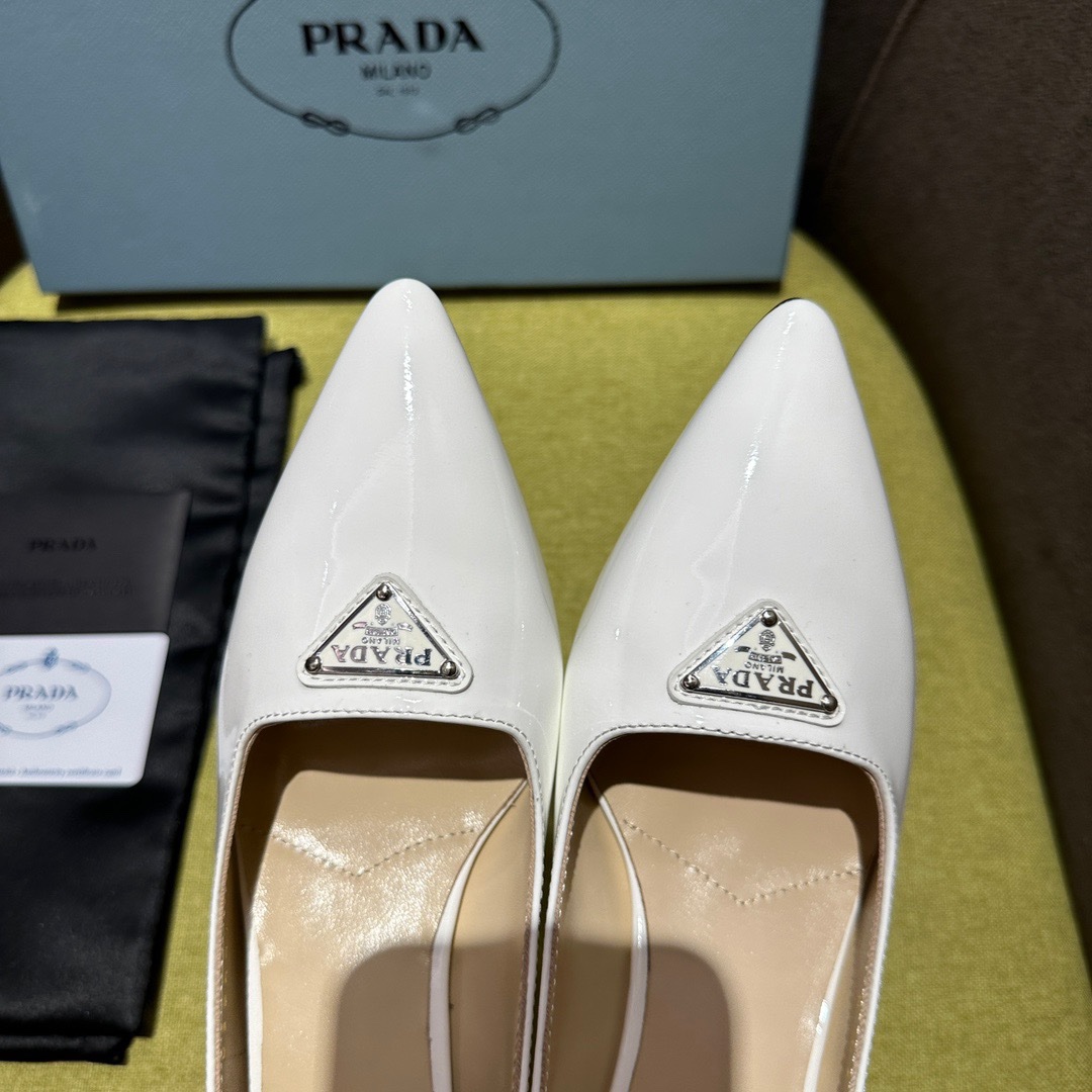 This tapered patent leather back strap shoe with graceful lines demonstrates the aesthetics of rigidity and softness. The iconic enameled metal triangle logo pops up on the upper for an added finishing touch.