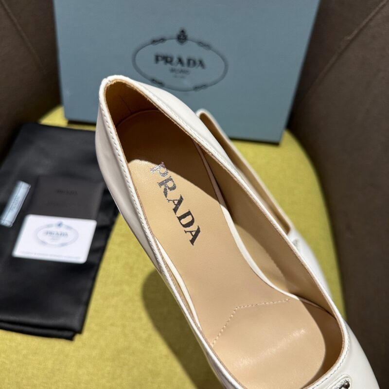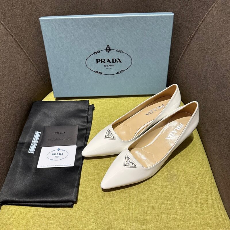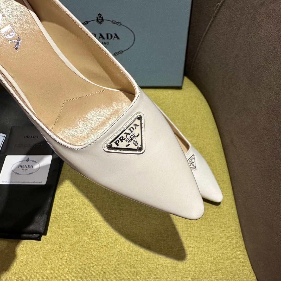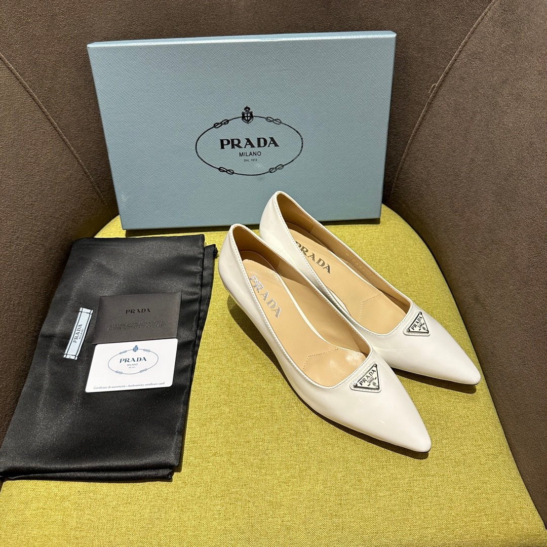 This tapered patent leather back strap shoe with graceful lines demonstrates the aesthetics of rigidity and softness. The iconic enameled metal triangle logo pops up on the upper for an added finishing touch.