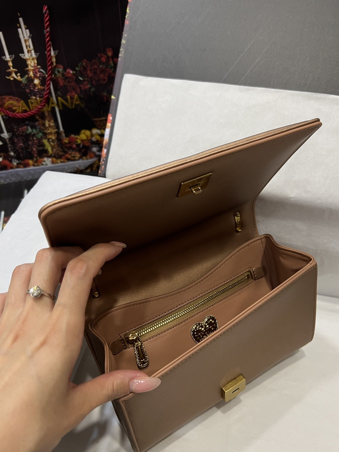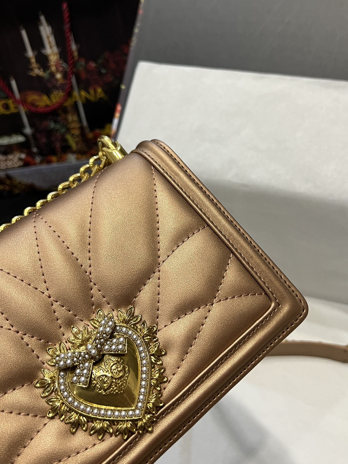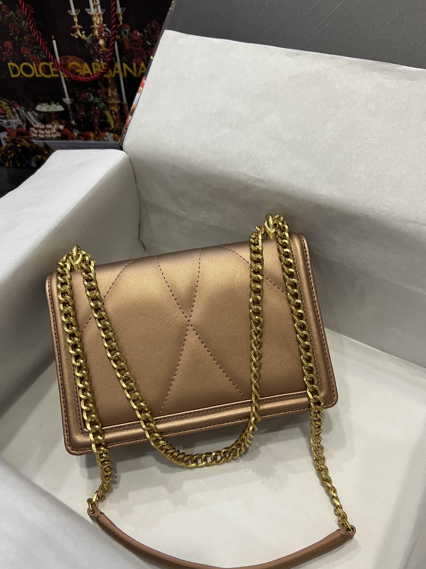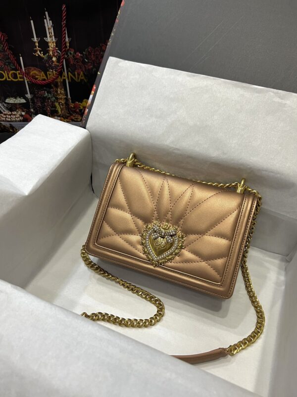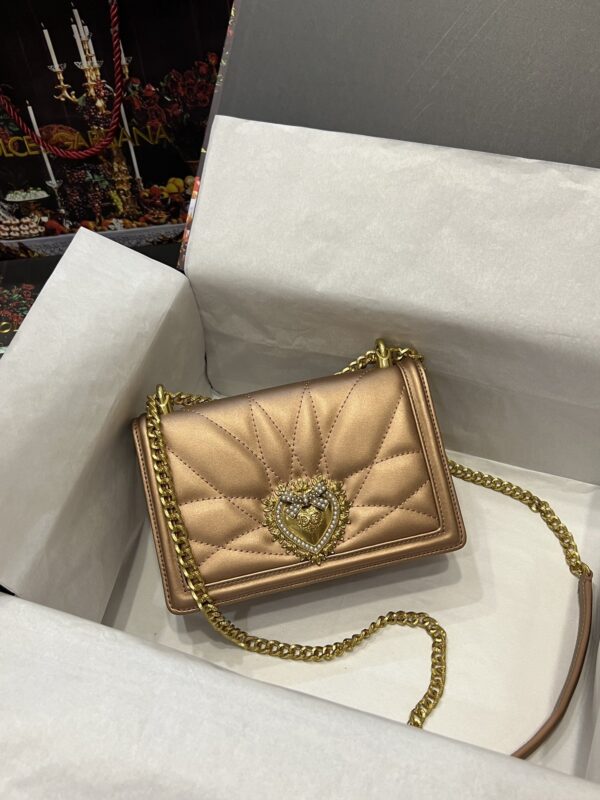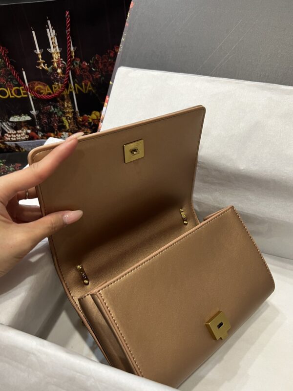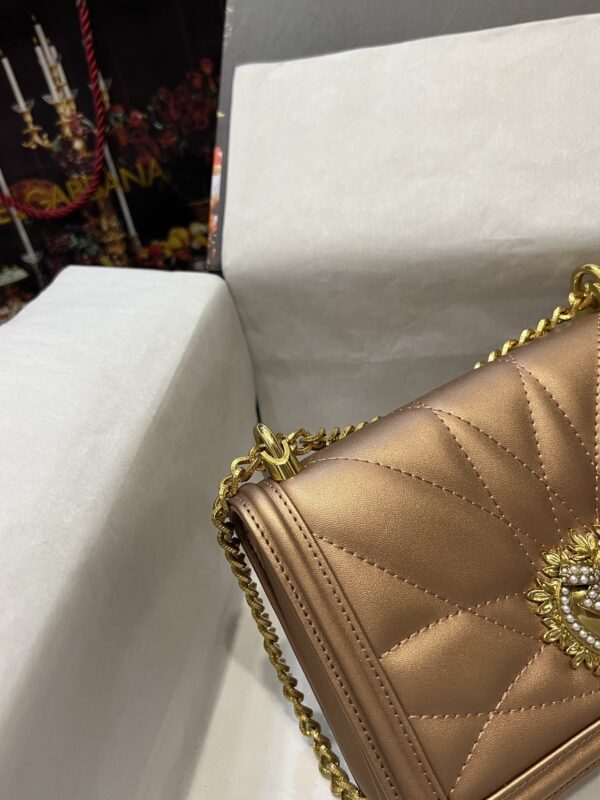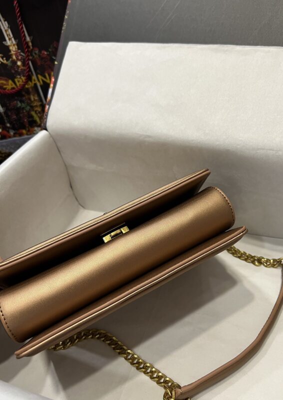 Re-engraved Dolce&Gabbana overseas purchasing special handbag. Simple and fashionable, the most popular crossbody bag is made of imported raw materials butterfly gold-plated DG logo inlaid with pearls. The front flap adopts hidden magnetic buckle closure and fixed electroplated ruthenium chain decoration Internal metal logo plaque size21 *14.5*3cm