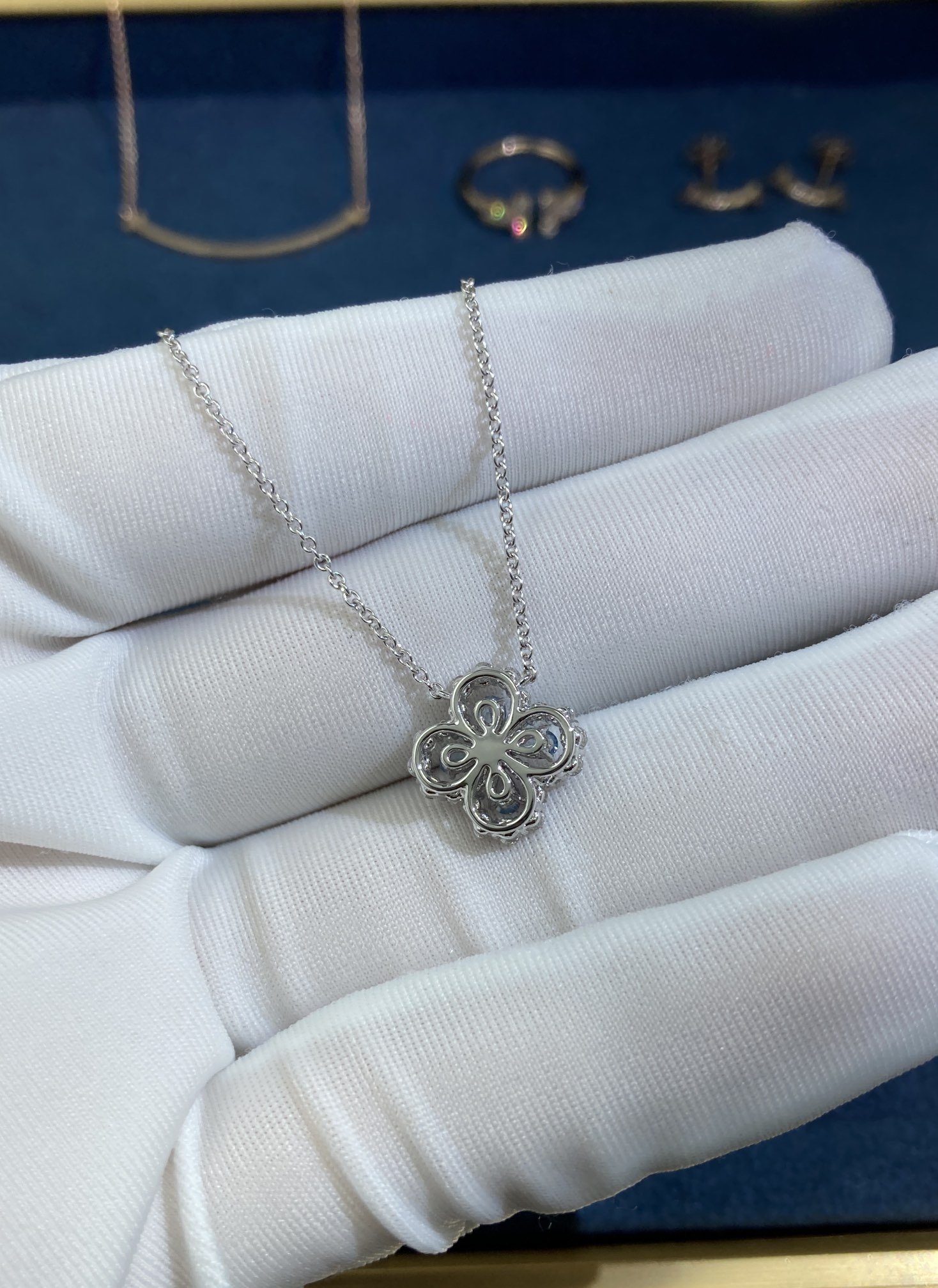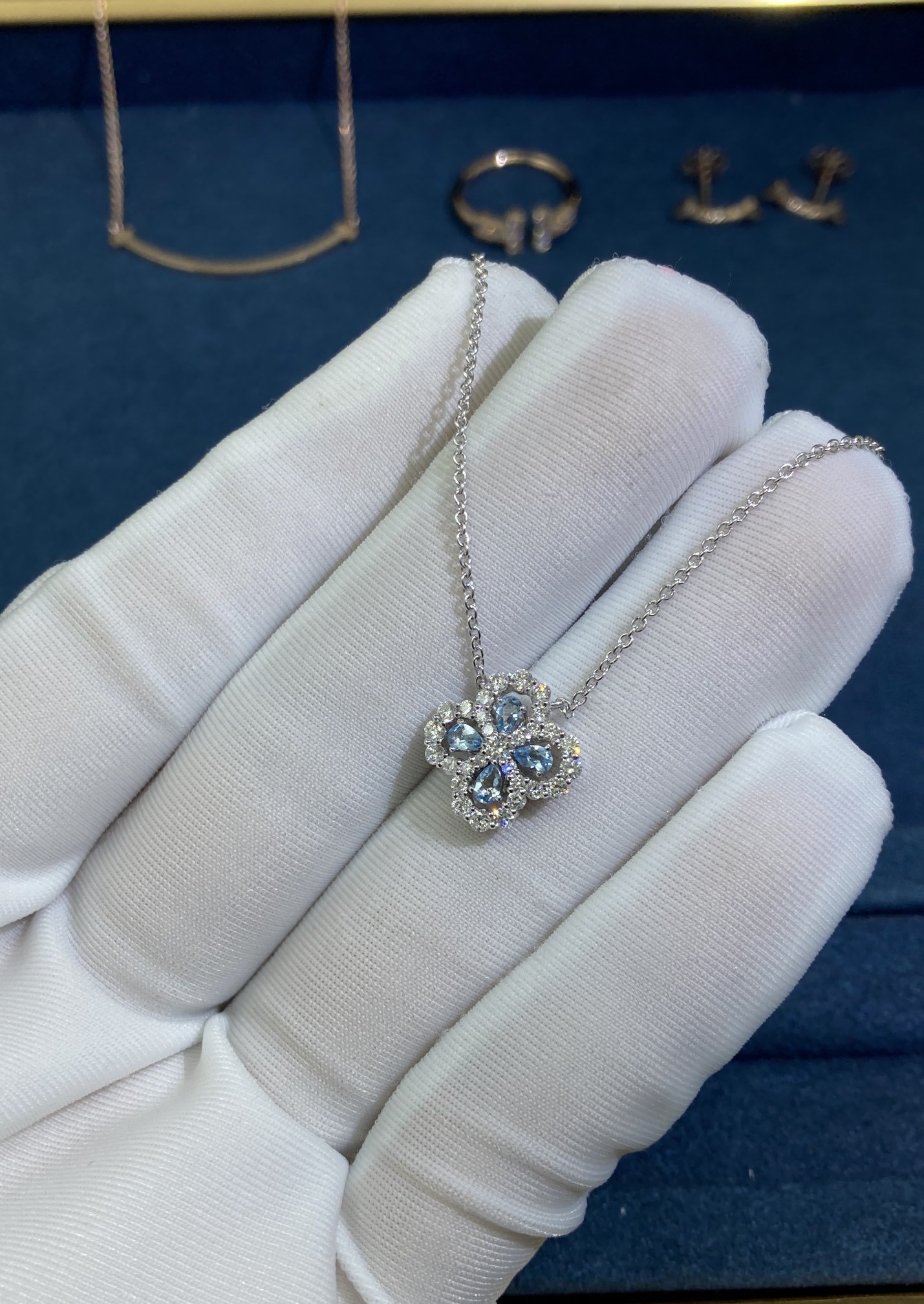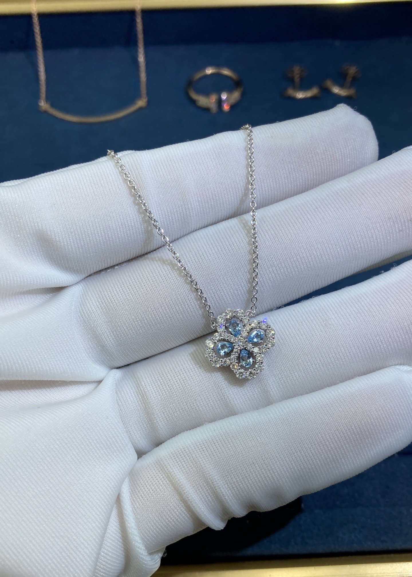 The metal used in pieces of jewelry are often a lustrous yellow or white gold, which is expertly polished to a mirror-like finish. The precious stones are carefully selected by our masters and set in a precise manner, showing off their color, clarity, and brilliance to their full potential.