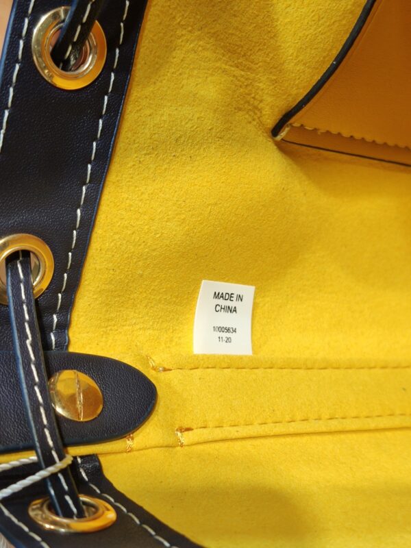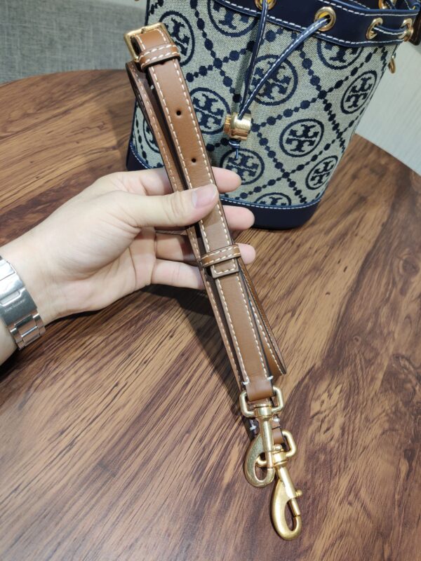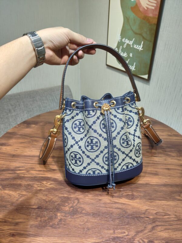 TORY BURCH Monogram 2021 Summer New Drawstring Bucket Bag The textured navy blue canvas fabric is matched with a neat bag body, and the embellishment of retro jacquard makes the overall shape more casual and classy.