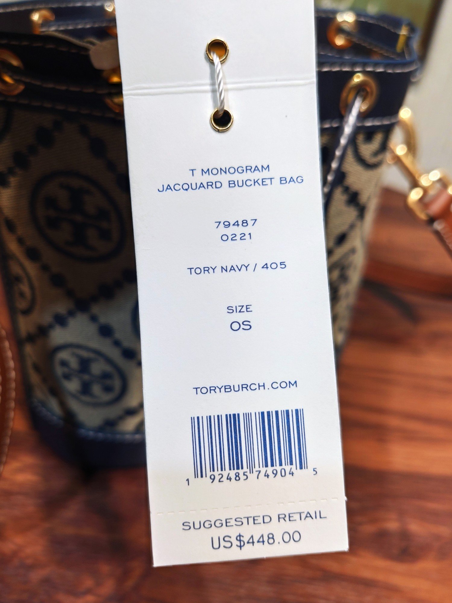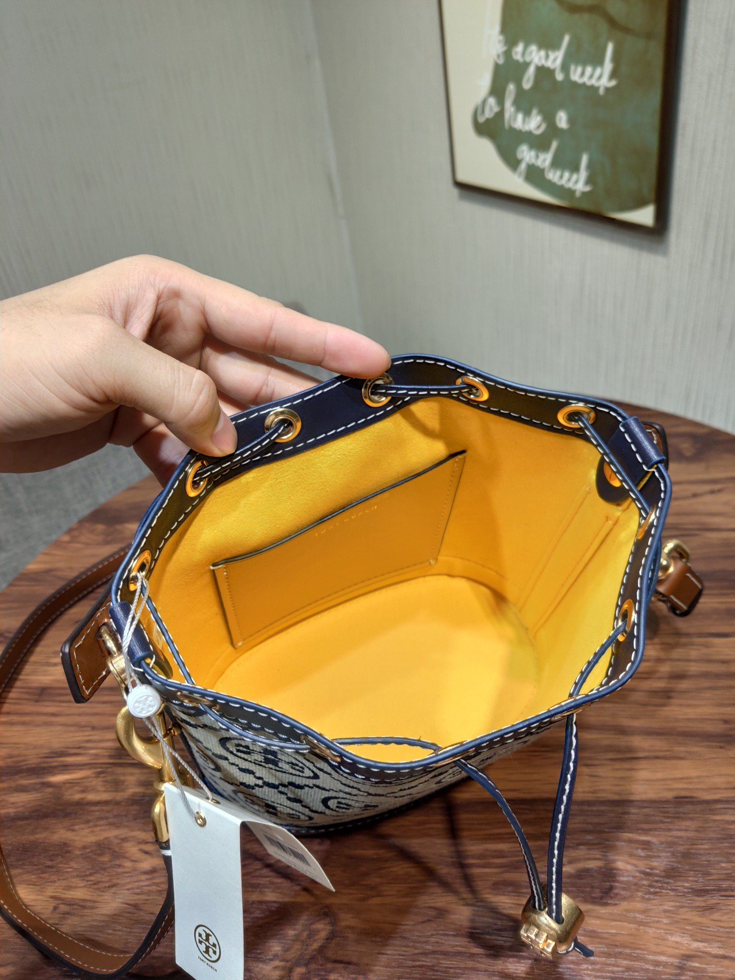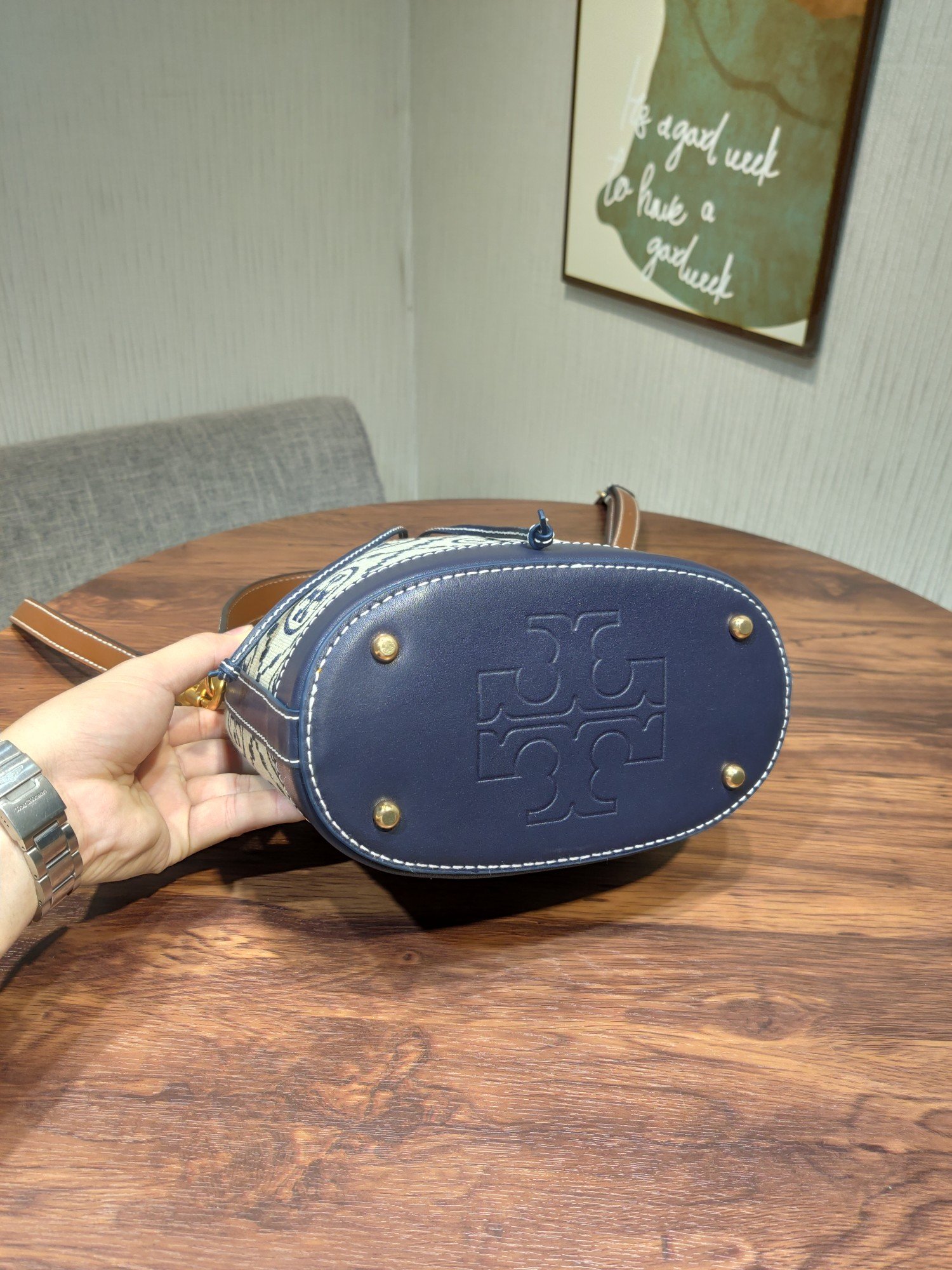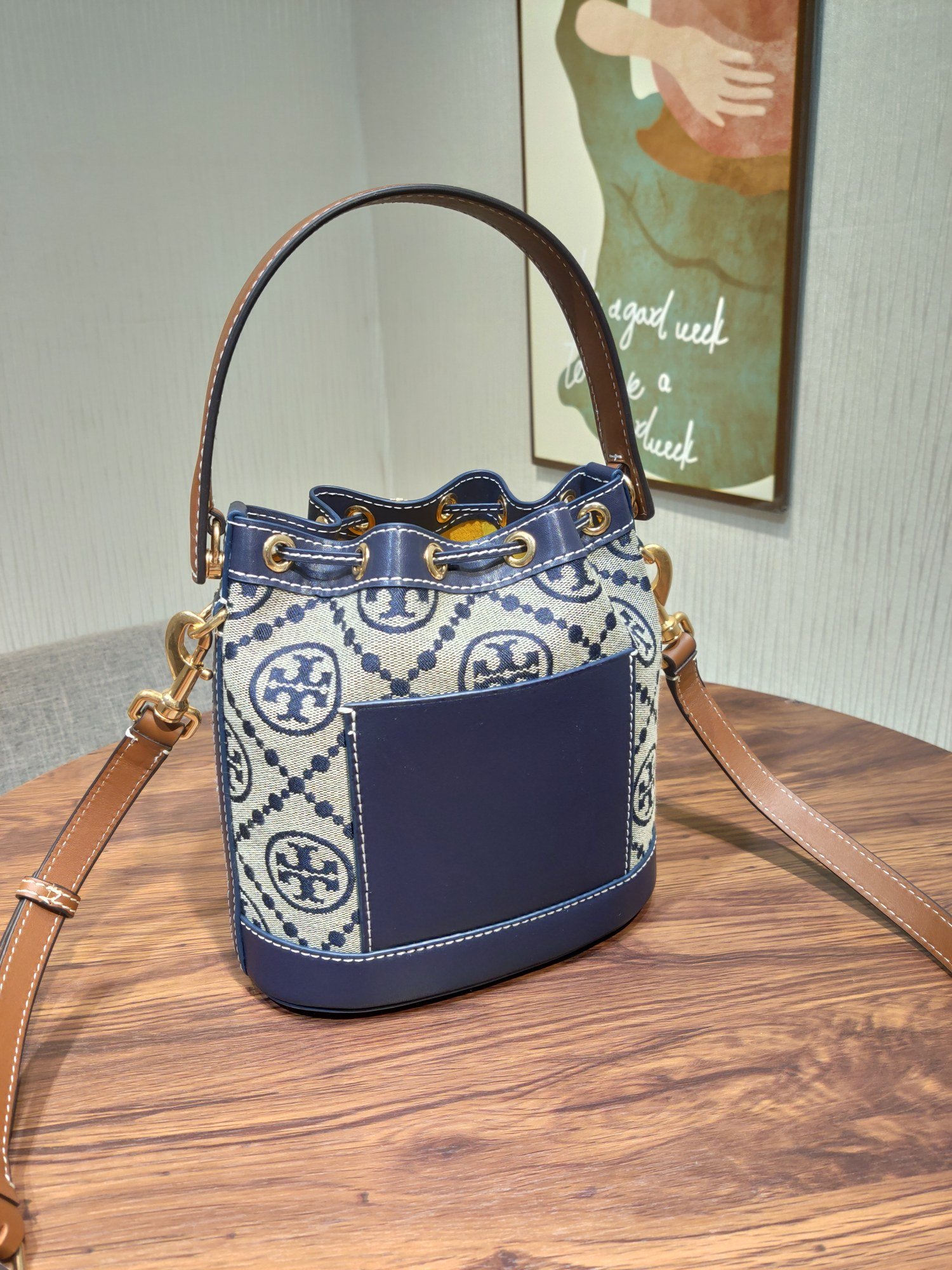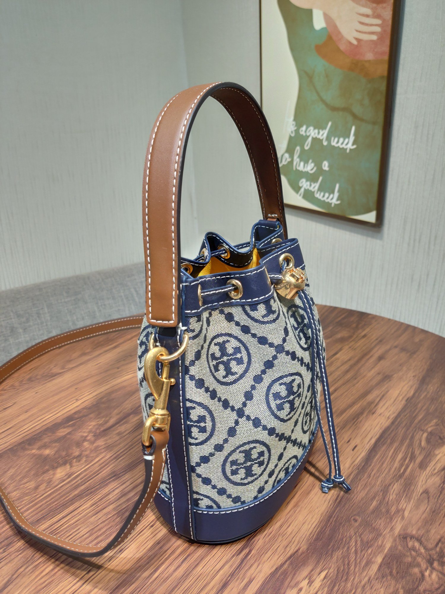 TORY BURCH Monogram 2021 Summer New Drawstring Bucket Bag The textured navy blue canvas fabric is matched with a neat bag body, and the embellishment of retro jacquard makes the overall shape more casual and classy.