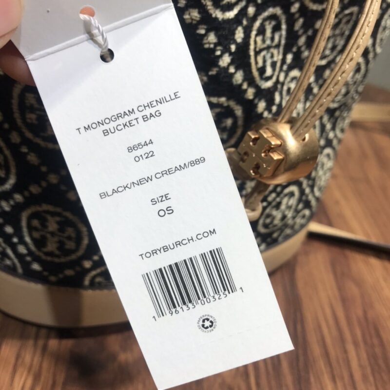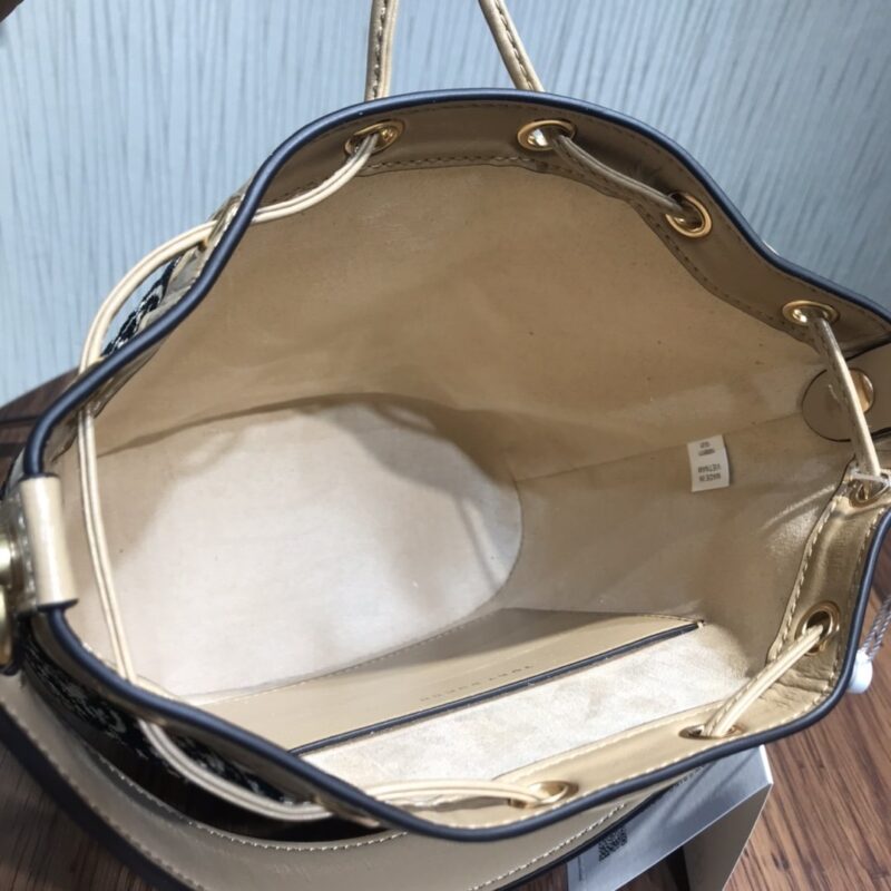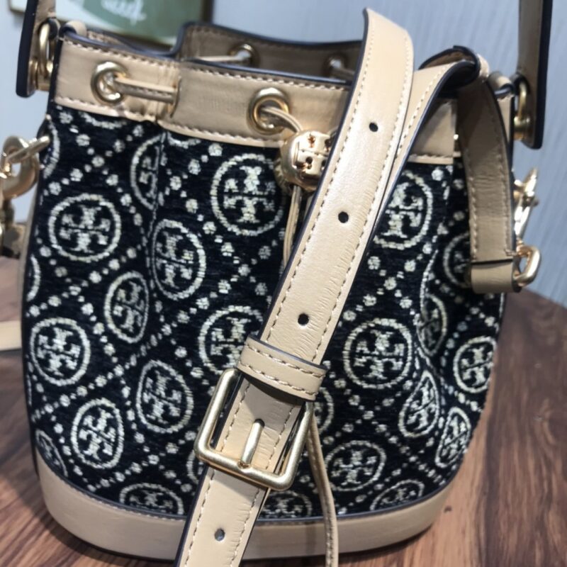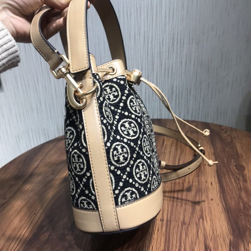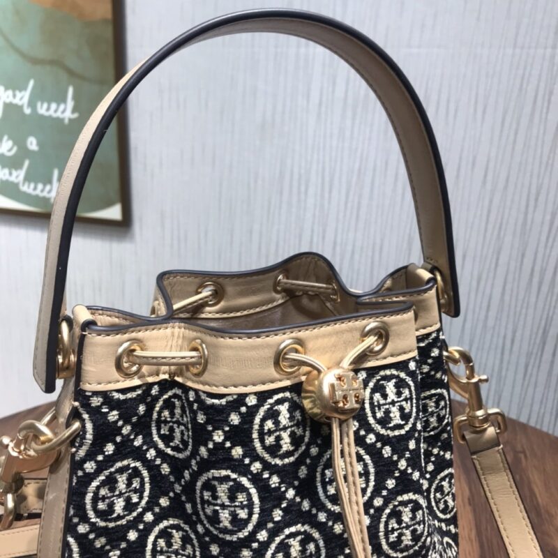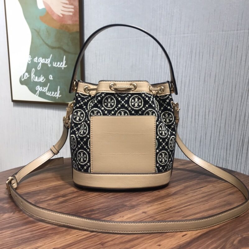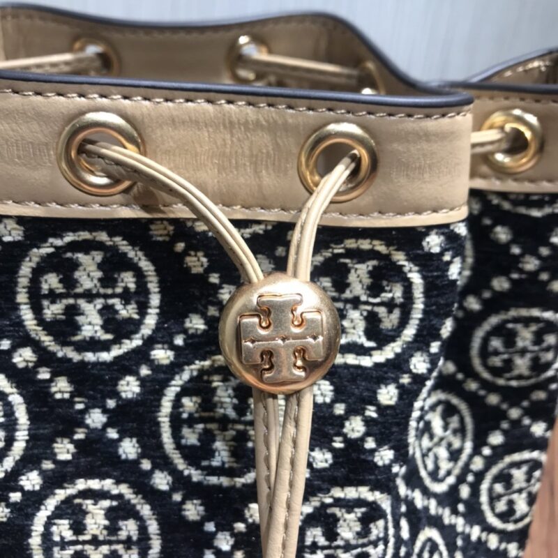 TORY BURCH Monogram 2021 Winter New Drawstring Bucket Bag The textured navy blue canvas fabric is matched with a neat bag body, and the retro jacquard embellishment makes the overall shape more casual and classy.
