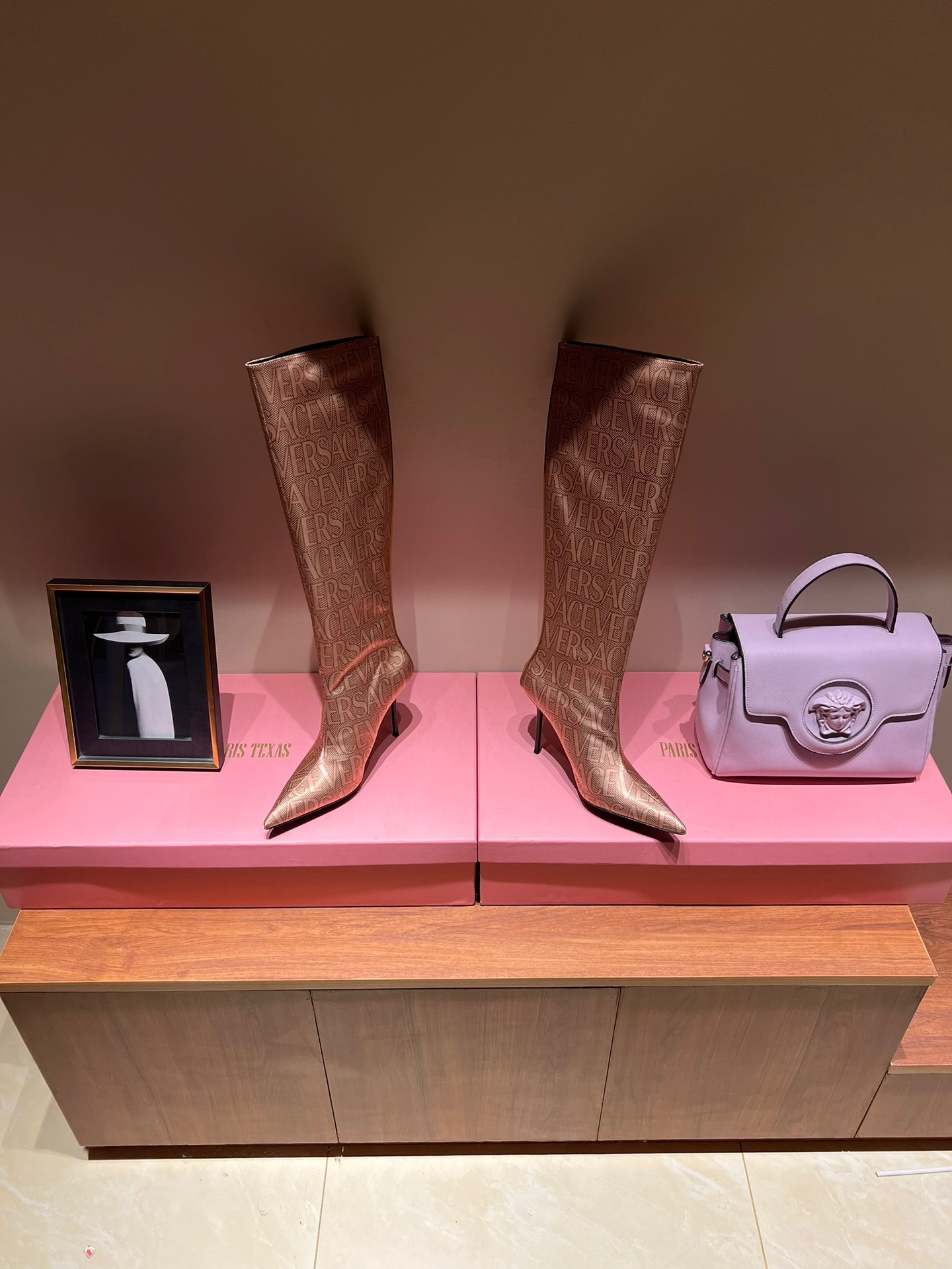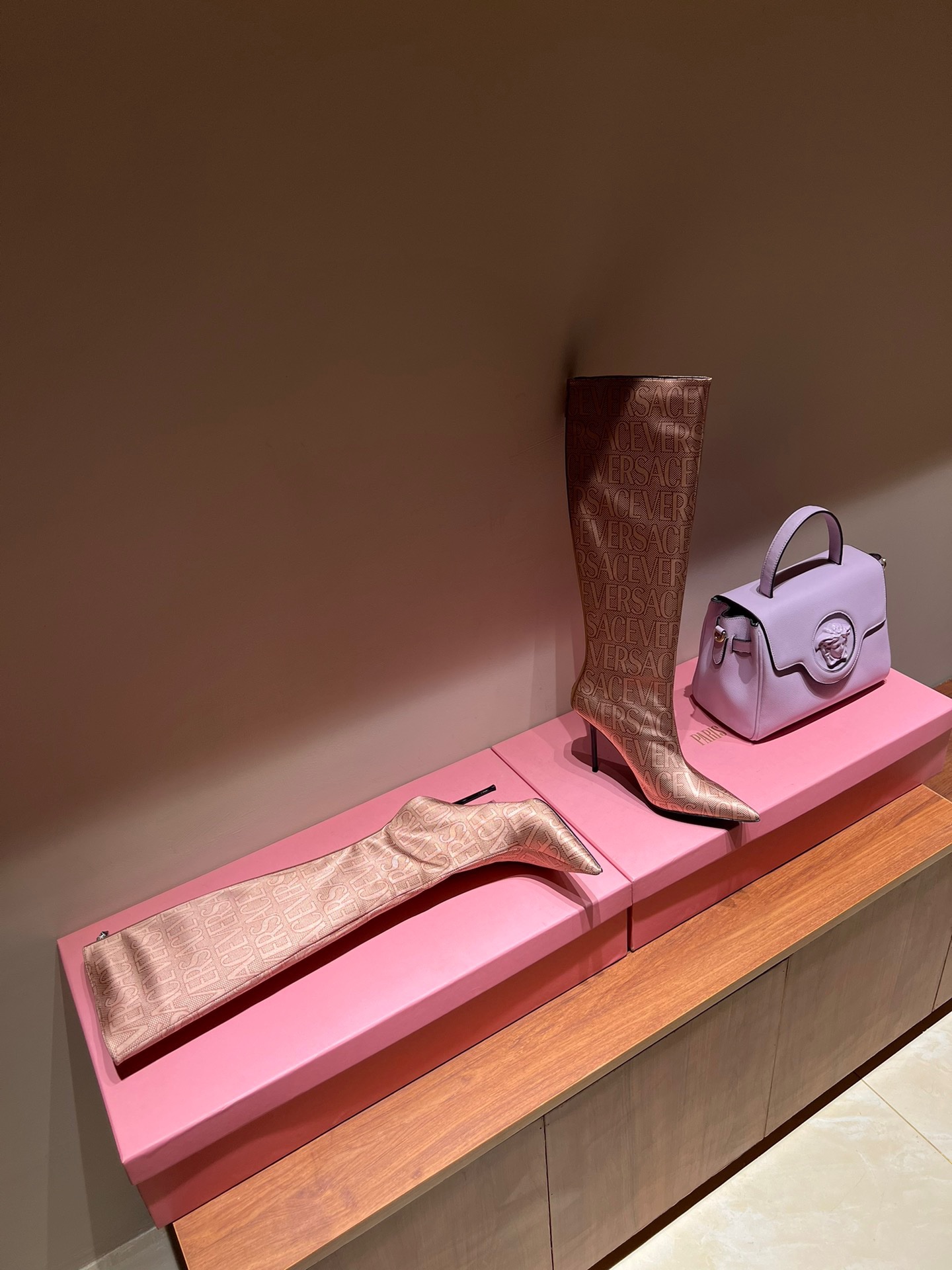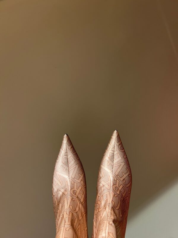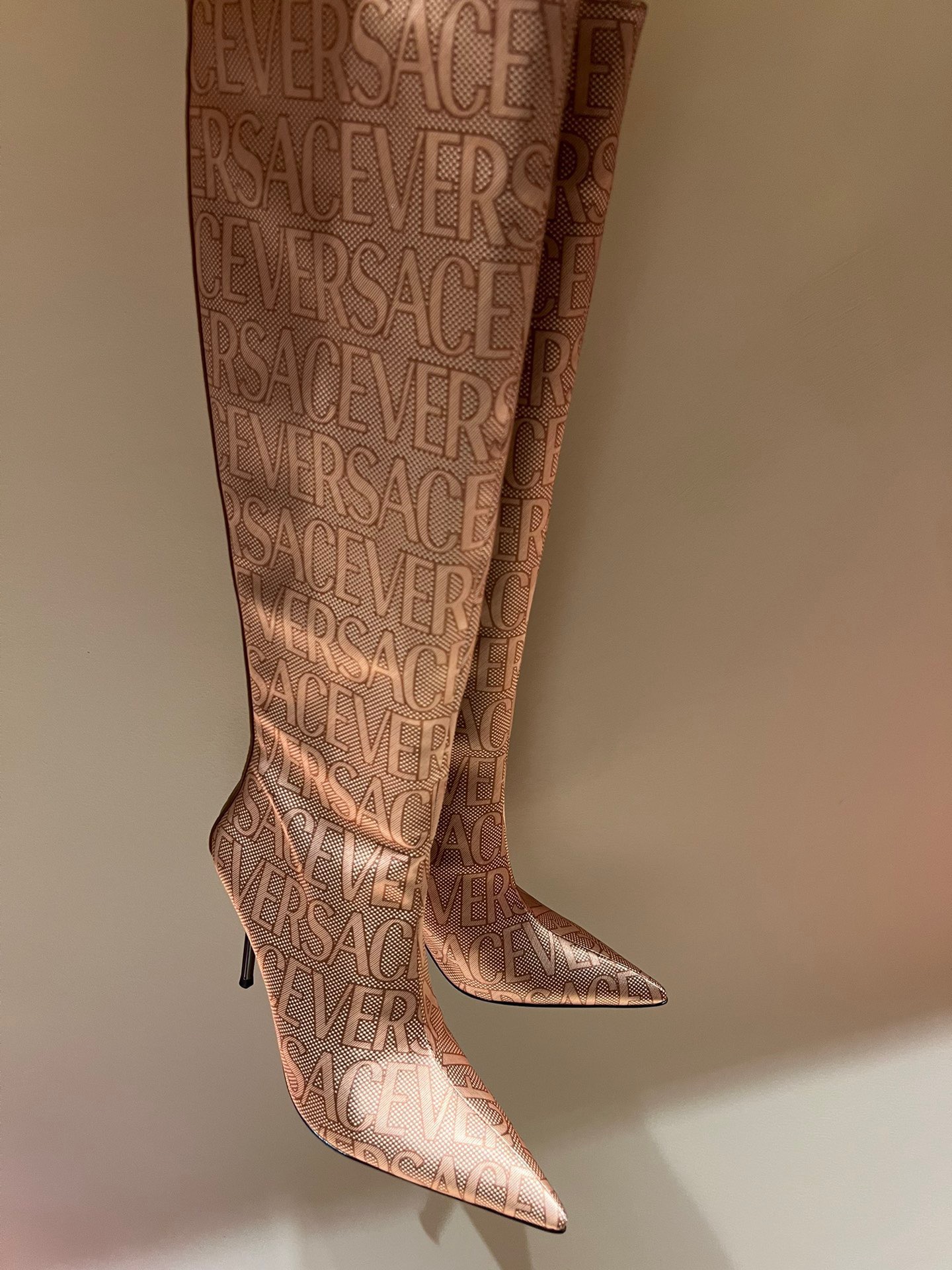 These knee boots are made of jacquard canvas with leather trim, pointed toe and stiletto heel! Simple and capable version, iconic printing 3D letter process, bright colors and free outlines!