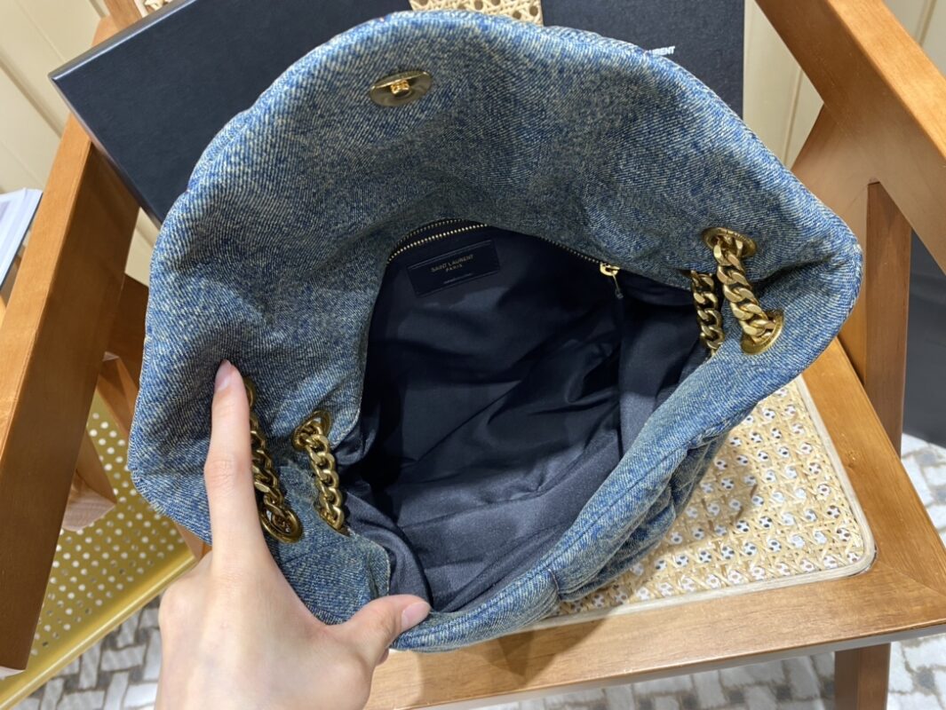 LOULOU PUFFER denim pattern large quilted bag, the ultimate denim washing process, feels soft and comfortable, as if embracing a cloud; the classic Y logo, chain and buttonhole hardware are all made of bronze gold hardware, and the opening of the bag is folded. The magnetic four-button closure is used, and the airtightness and safety are first-class; there is a zippered inner pocket in the bag to store mobile phones and valuables. In addition, there is no extra inner pocket design, so you can use it as you like.Size: 35x23x13.5cmModel: 577475 denim pattern
